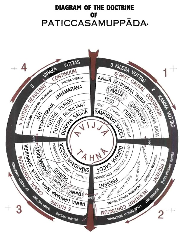 ignorance (avijja), craving (tanha), clinging (upadana), sankhara, kamma