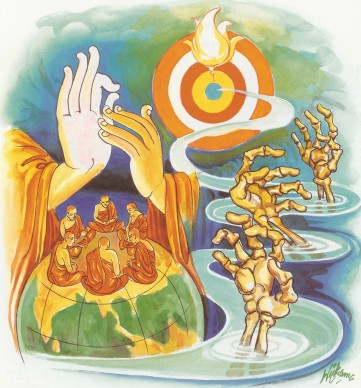 Zo begon de Boeddha zijn verheven missie die hij tot aan het einde van zijn leven volhield. Met zijn discipelen liep hij over de hoofdwegen en binnenwegen van Jambudipa, het land van de Roos-Appel (een andere naam voor India) omgeven door de aura van zijn grenzeloze mededogen en wijsheid.